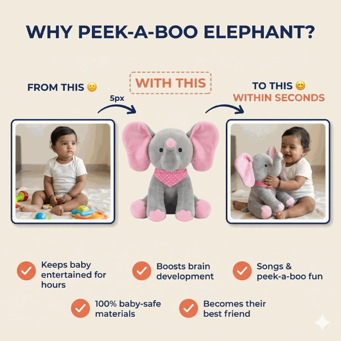 Introducing Indiaβs first interactive peek-a-boo elephant β the top-rated toy that brings instant joy to every child. Whether your baby is fussy or ready to play, this adorable companion keeps them smiling, laughing and happily engaged. It gently turns tears into giggles and keeps little ones entertained for hours. Discover why this exclusive elephant is becoming every parentβs first choice in 2026.